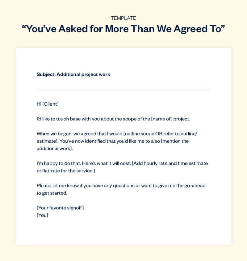 So, the sooner you adequately address these requests—and let clients know that you’ll need additional compensation for any additional work—the better. Here’s an email template that will help you do exactly that: