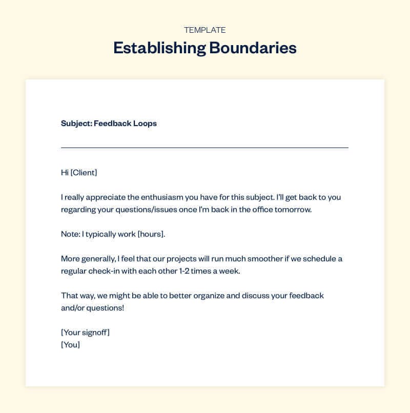 Again, you can solve these 2 problems with a carefully crafted email. The 1st email template below helps you set clear boundaries, so you’re not at the client’s beck and call—and the 2nd improves workflow, so you’re not running on constant urgency.