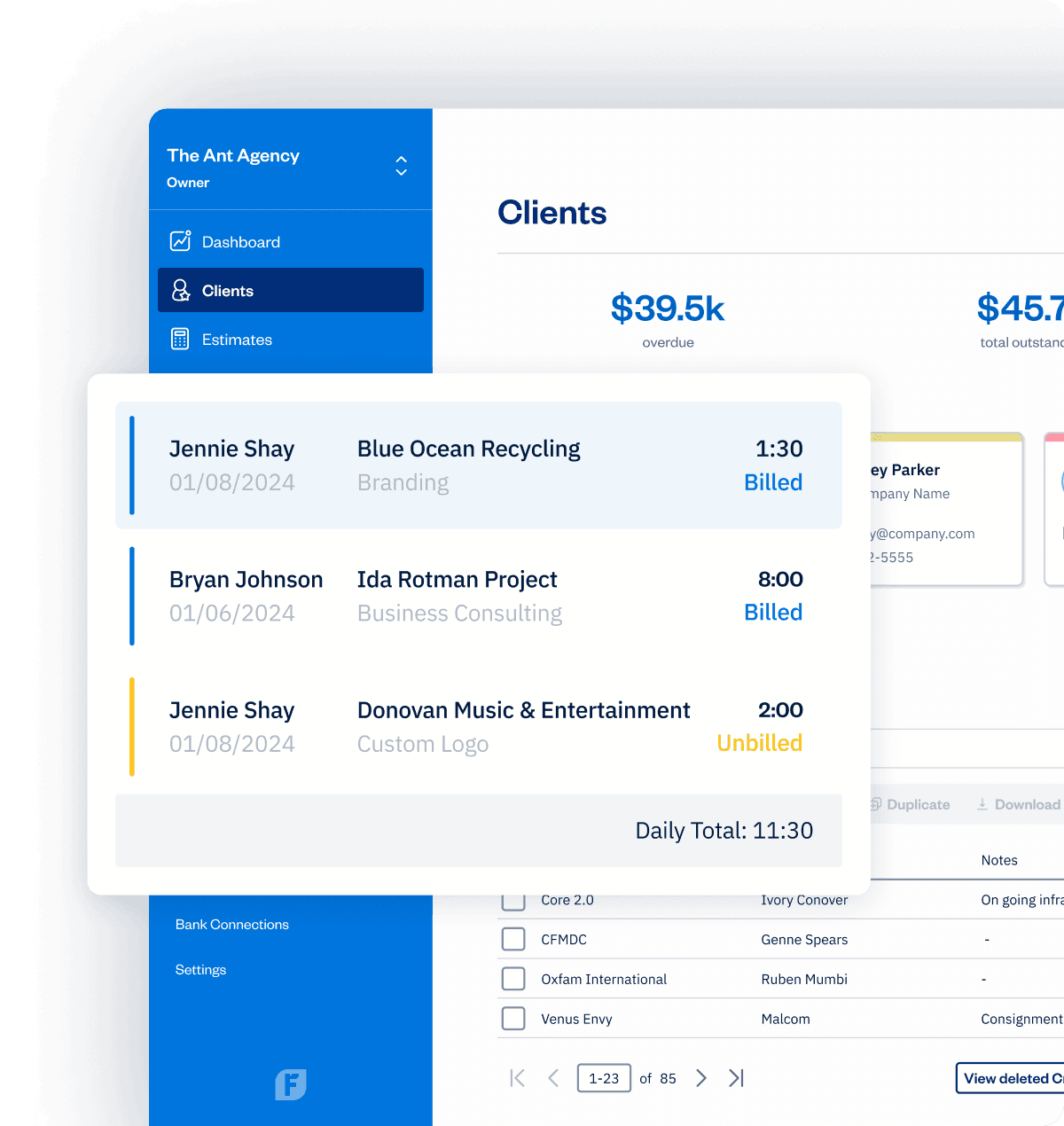 Keep clients informed and engaged with Projects, so you’re always on the same page. And log every billable minute with Time Tracking to record all work and send more accurate invoices..