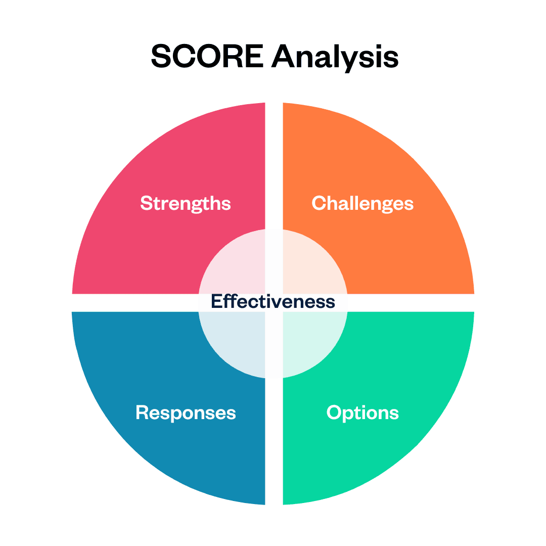 An action-oriented tool like SCORE may be better if you want to develop a strategic improvement plan. SOAR may be better for big-picture brainstorming. And NOISE may be best for digging deep into complex questions.