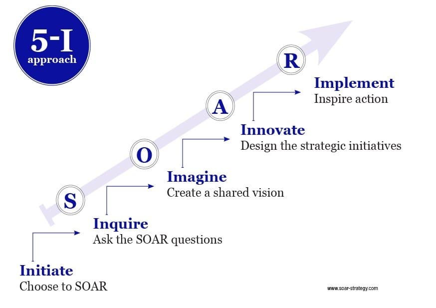SOAR analysis is based on the principles of collaboration. The method encourages you to apply a series of action steps with your team after your SOAR research. These steps are referred to as the 5 I's: Initiate, Inquire, Imagine, Innovate, and Implement.