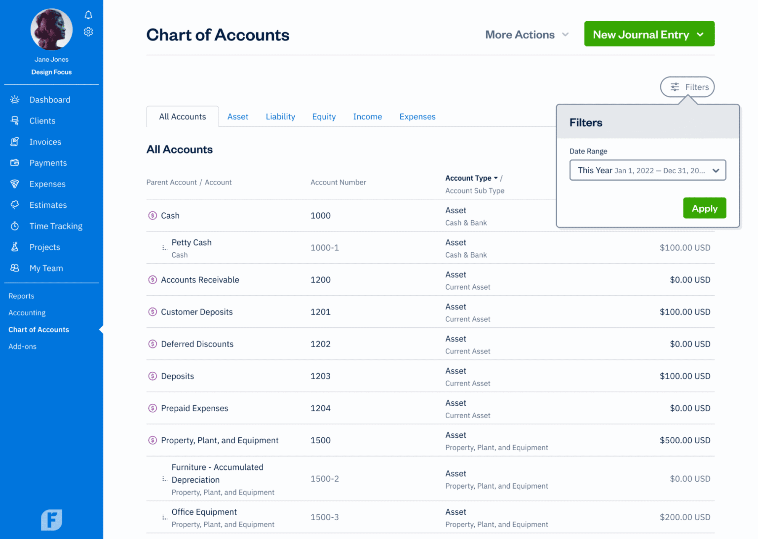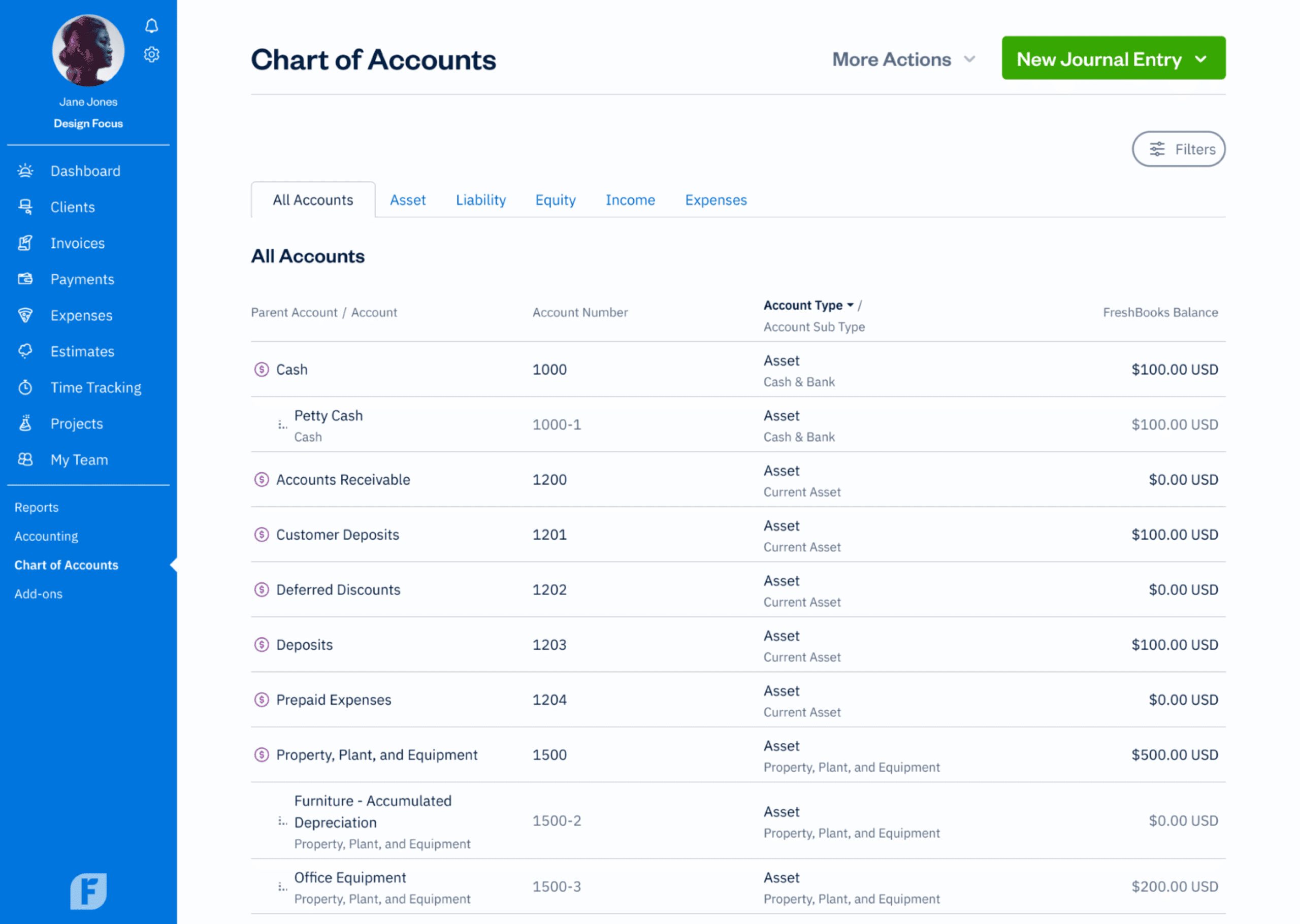 FreshBooks offers 3 advanced accounting tools that are essential in double-entry accounting and will help you plan for the future of your business: The Chart of Accounts, General Ledger, and Trial Balance. (Available on Plus, Premium, and Select plans.)