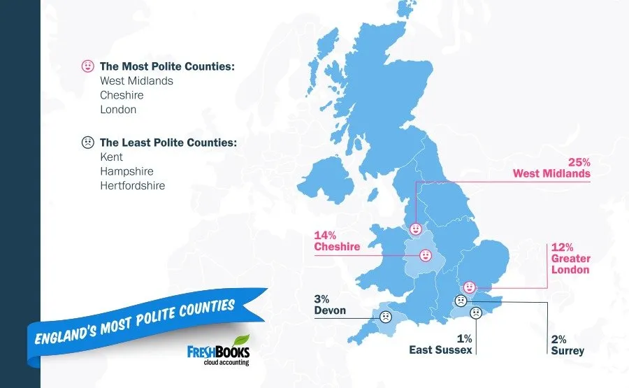 - West Midlands is the most polite county overall, with 25% of invoices sent out containing please and thank you