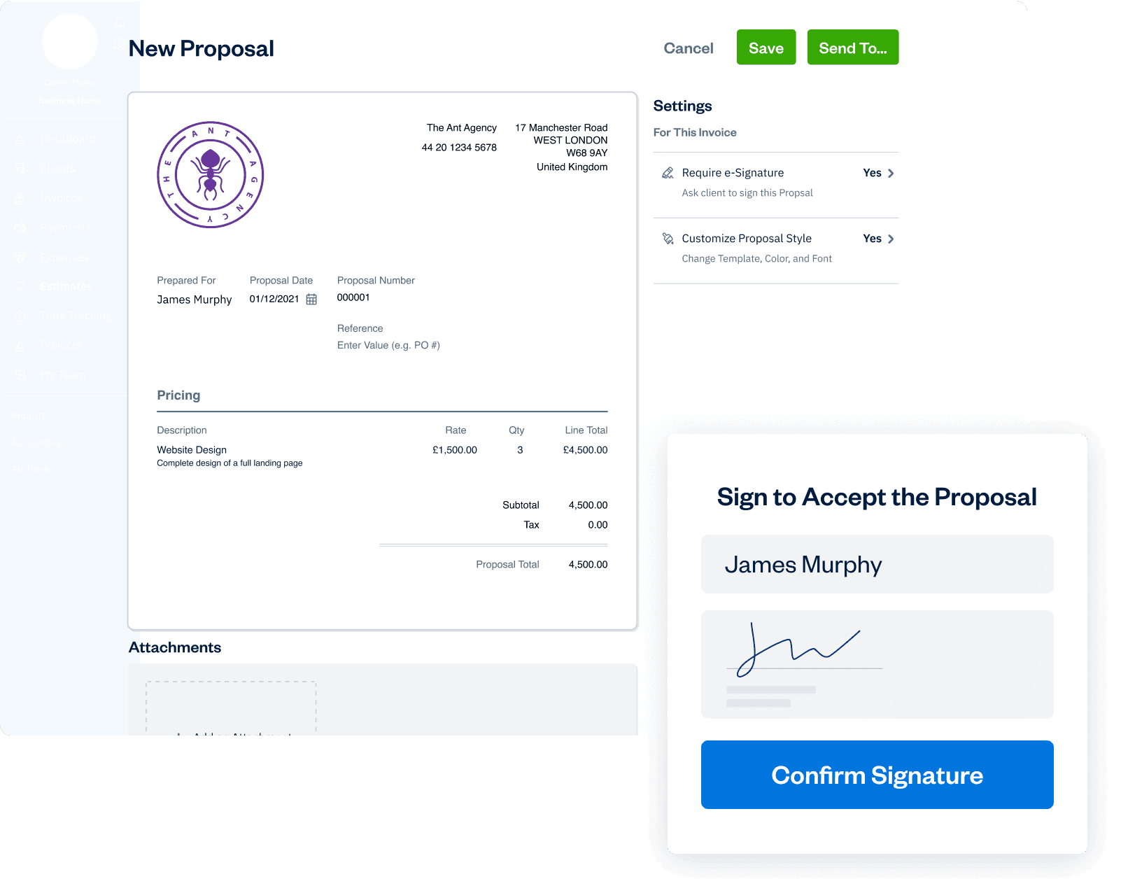 Custom Proposals give your clients all the details, supported by images and attachments. Scope it out, outline their needs and how you meet them, then click send.