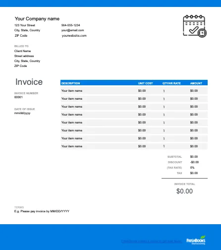 Email is the quickest and easiest way for event planners to send their invoices. A free event planner invoice template by FreshBooks can be downloaded in a variety of formats, including Google Docs and Google Sheets. Just fill them out with the important details and email them to save time.