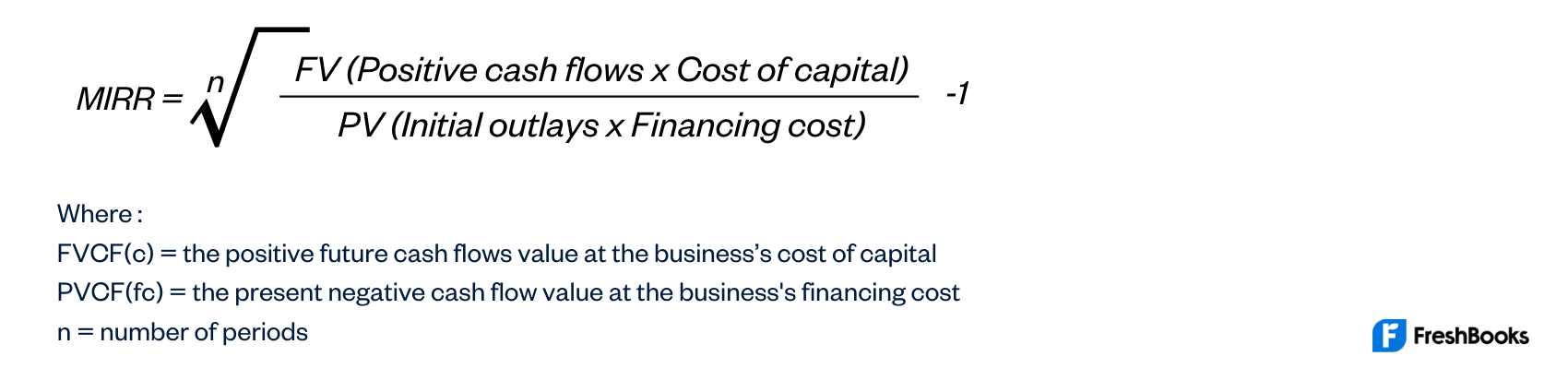 The formula for MIRR can be expressed as the following: