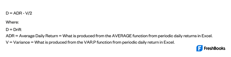 Next, you would use the Excel functions AVERAGE, STDEV.P, and VAR.P on the entire resulting series. This is to obtain the average daily return, the standard deviation, and the variance inputs. The drift is equal to the following formula: