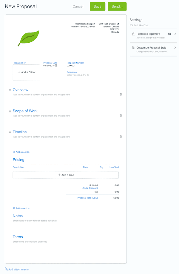 FreshBooks lets you attach documents to your proposal, making it easy to include a cover letter and send the entire proposal package to your client.