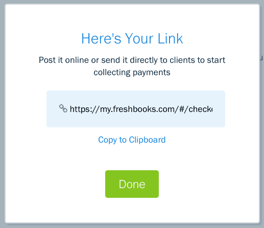 - A pop-up will appear with the link – click Copy to Clipboard and then Done. Now you can paste it anywhere you want to accept payment.