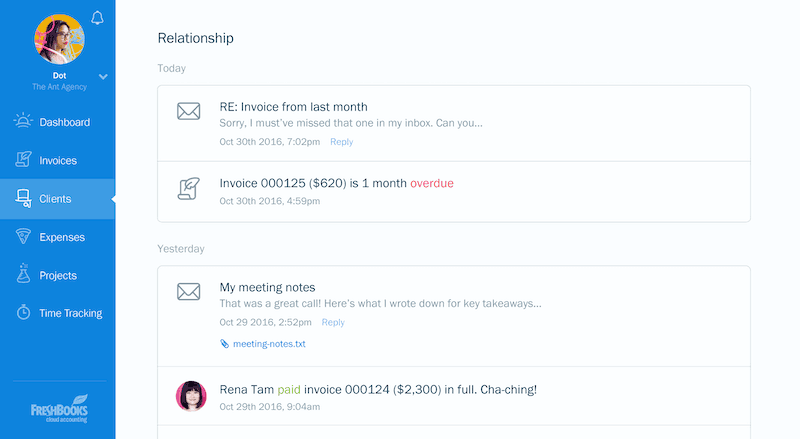On the Client Profile page in FreshBooks, the relationship feed will show you the most recent invoicing updates as well as your Gmail for Work email correspondence with that client. This is an easy way to keep track of where you and your client left off in FreshBooks without having to search through your email inbox.