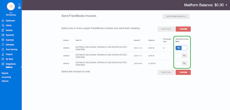 Mailform retrieves customer names, addresses, and invoice from your FreshBooks account, and then prints them out, stuffs the envelopes, stamps them, and hands them over to the postal service.