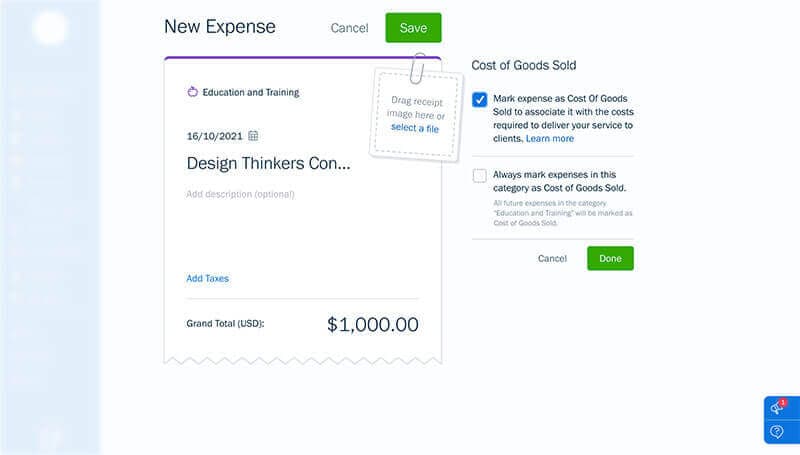 You’re in the middle of a project and keep racking up expenses on behalf of your client. Instead of worrying about being out of pocket, you can now simply track your spending on-the-go and categorize it as COGS.