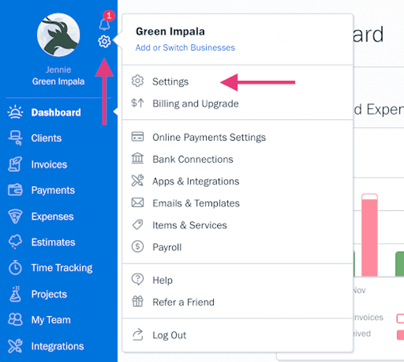 The settings menu allows you to manage your business on FreshBooks. It provides access to your login info, your company details, and your default logo and theme.