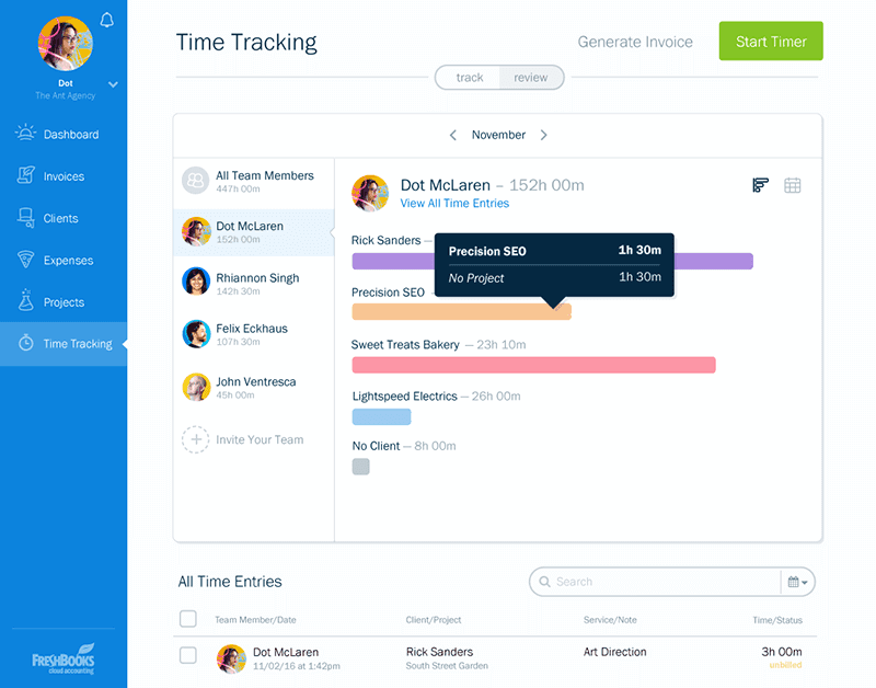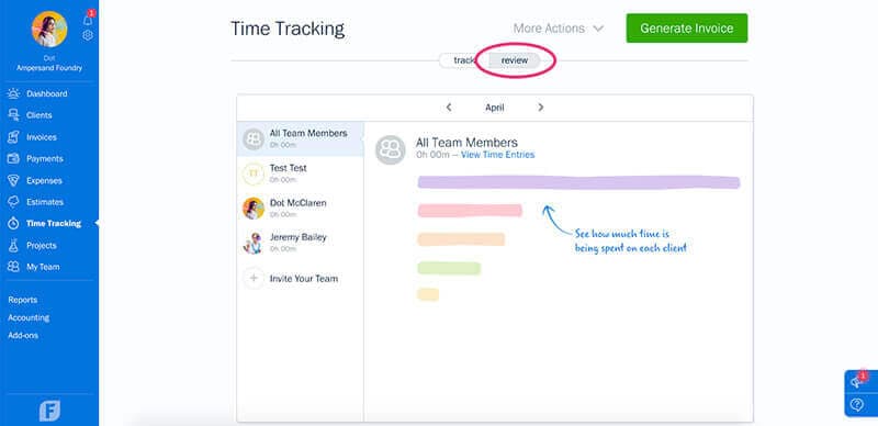 To help you stay on top of everyone’s hours, FreshBooks has added Team Time Tracking. Now you can easily review logged hours and view trends that will help you and your Team work more efficiently, invoice with confidence, and better predict the length of future projects.