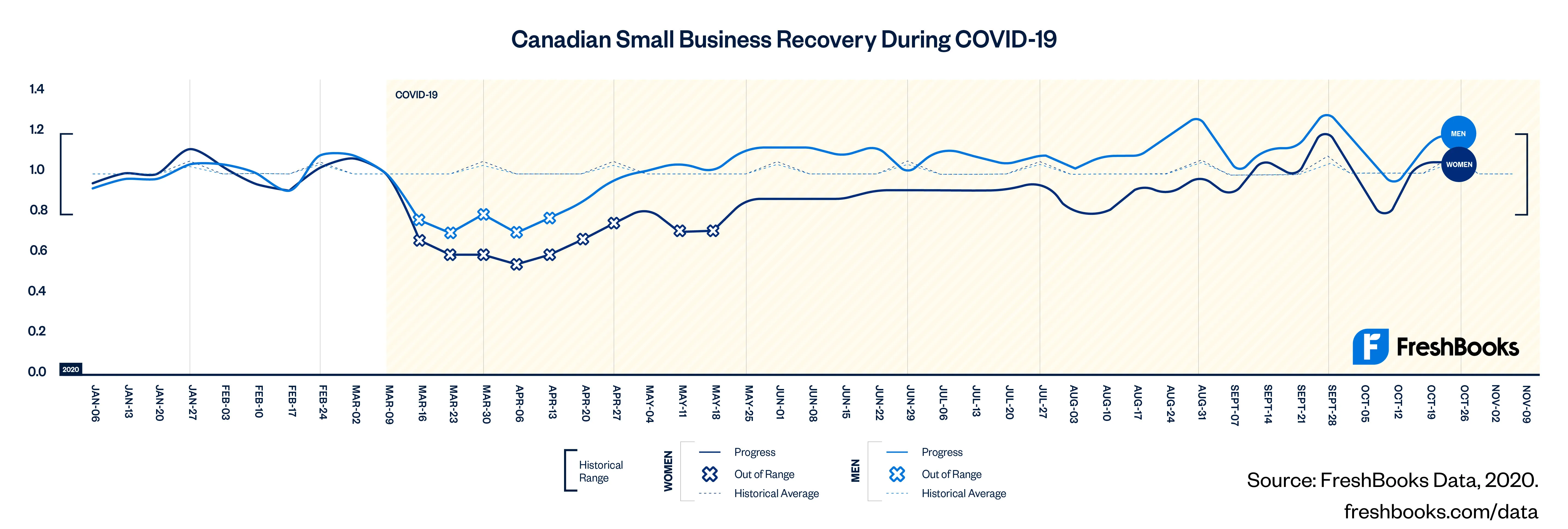 There are many reasons why this could be happening. Based on a survey FreshBooks administered to 2,200 small business owners in the U.S., we know that women are more likely to care for children and the elderly, in some cases meaning they had to take time away from their business.