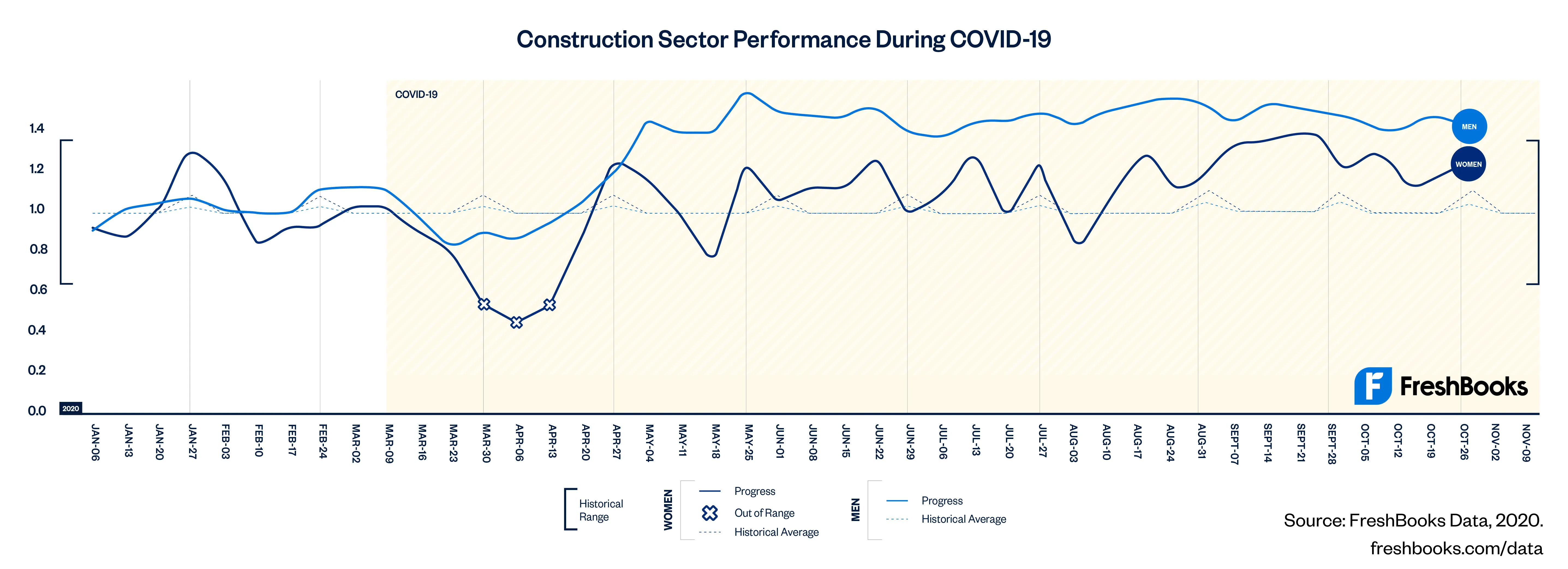 The key to success in service-based industries like construction is new clients. In the case of Canadian construction companies, businesses owned by men experienced no interruption in client acquisition, while Canadian women-owned businesses experienced three consistent weeks of adding less than their average number of clients. In addition, women-owned construction companies have experienced a lot more volatility than their male counterparts; while businesses owned by men have seen significant and quick growth, women-owned businesses are seeing peaks and valleys instead of regular continuity of business.