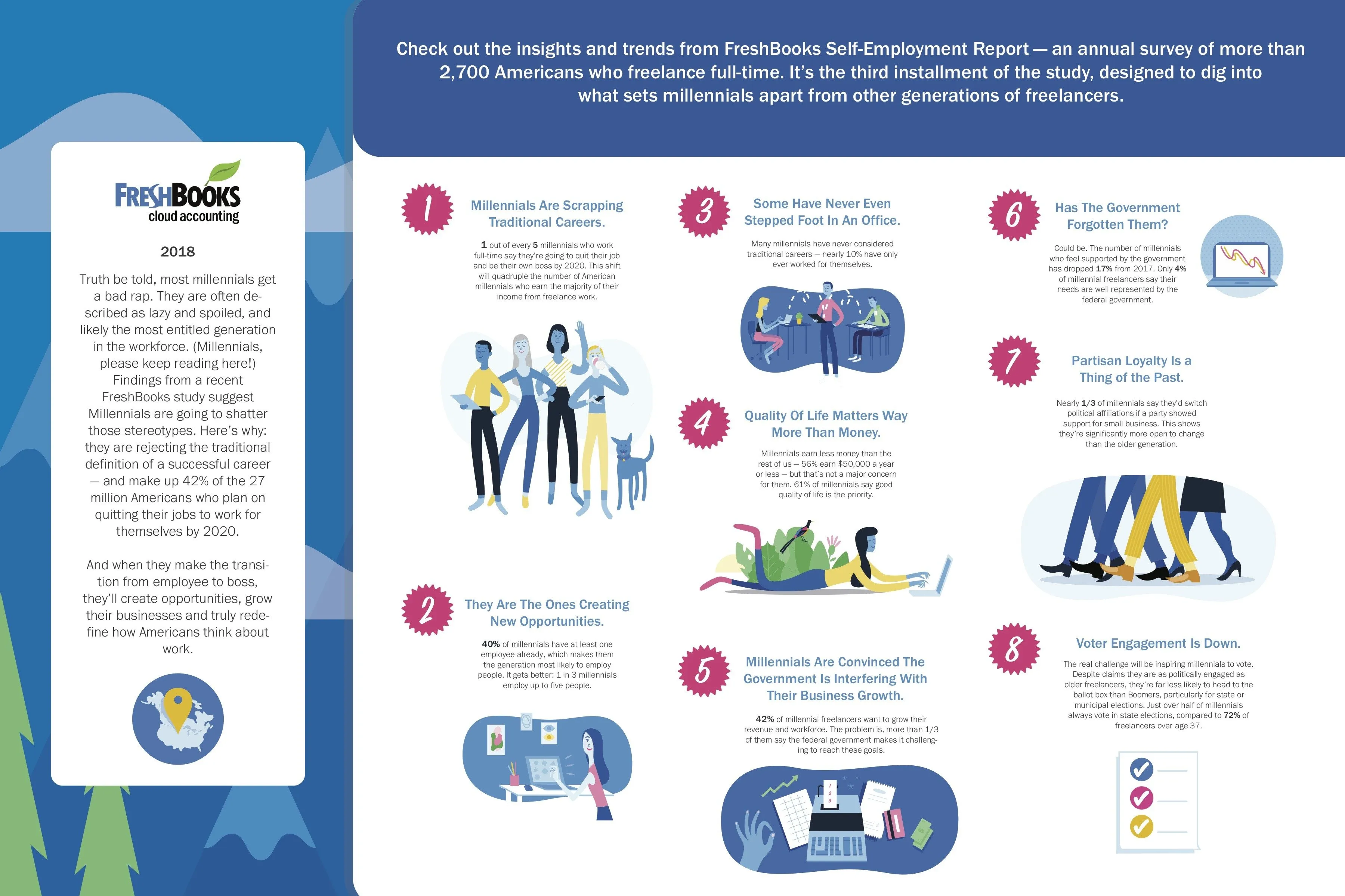 “The millennial generation is now the largest segment of the workforce, and they behave differently than their parents and siblings. Their tendency towards self employment is a big part of that,” said Mike McDerment, co-founder and CEO, FreshBooks. “Given their size, and the long term influence they will have over the economy, we would all do well to understand them better.”