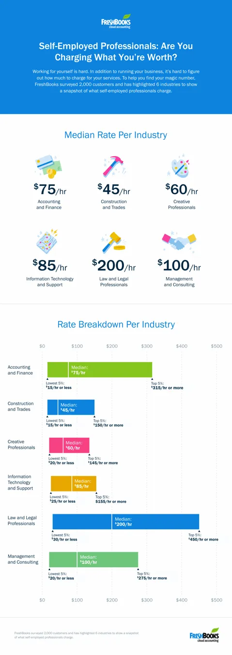 • Creative professionals, like artists and graphic designers, have the smallest spread of hourly rates—charging anywhere from $20/hr to $145/hr, with a median rate of $60/hr.