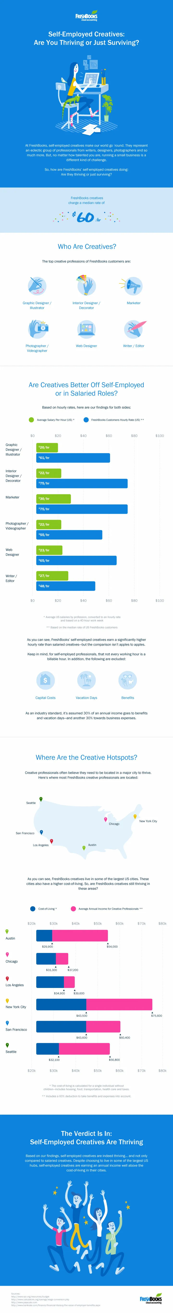 “We hear from freelancers all the time who don’t have access to real market data to help them determine what they should be charging, and as a result, end up underpaid for their expertise,” said Mike McDerment, the co-founder and CEO of FreshBooks. “When we took a closer look at the data what we found surprised us: self-employed creative professionals are not only earning more than their salaried peers—they’re thriving in some of the most expensive cities in the United States.”