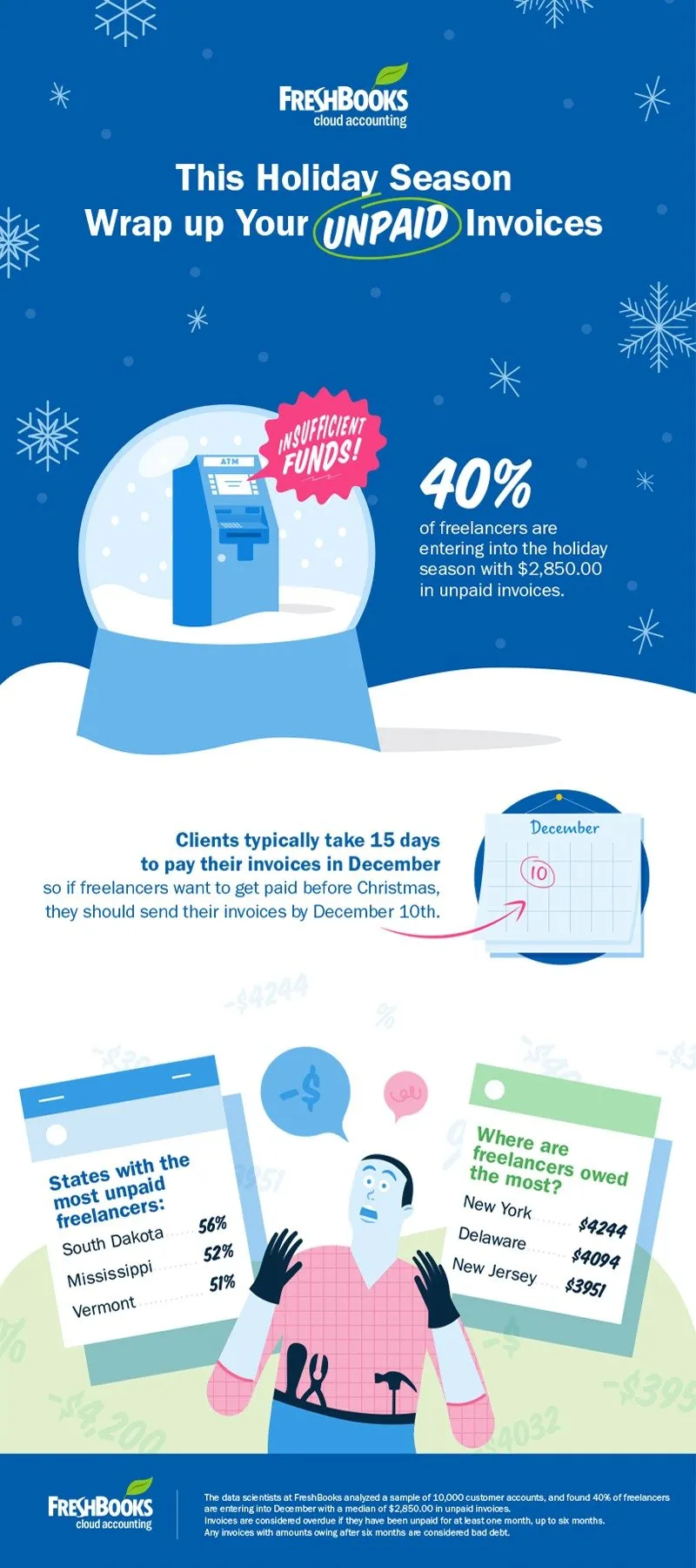 But the very nature of freelancing means income is often inconsistent, which can be especially trying around the holidays. There’s no such thing as a holiday bonus for freelancers. In fact, based on a sample of 10,000 customer invoices, the data scientists at FreshBooks discovered that 40% of freelancers will enter into December with $2850.00 in overdue invoices.