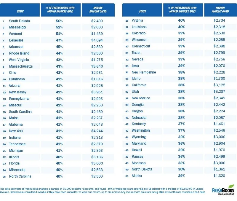 Check out the infographic below for the full findings and a breakdown of all 50 states. Plus, the FreshBooks team has compiled some tips to help freelancers get paid faster.